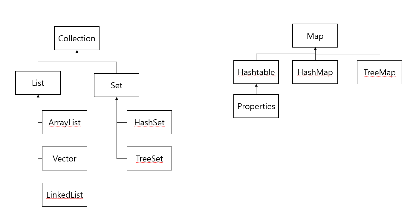 - HashTable, HashMap, Properties, TreeMap 등이 Map 인터페이스를 구현 함